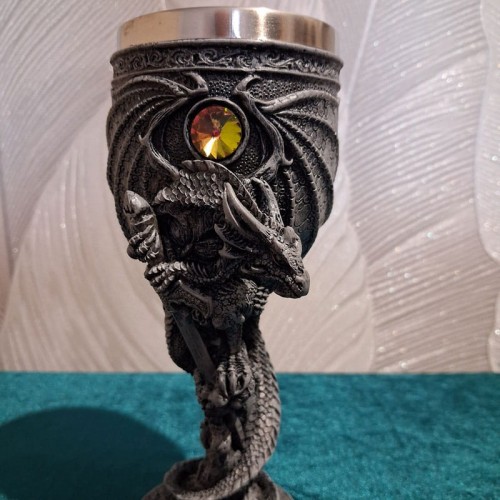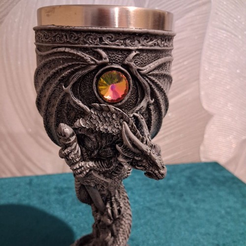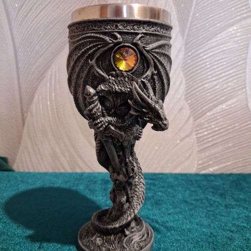 Дракон – архетипический хранитель знаний, земли и духовных сокровищ. На кубке он изображён как страж чаши: его крылья оплетают основание, а голова выходит на переднюю часть. Работая с таким кубком, вы обращаетесь к древней силе трансформации, огня и воды одновременно. Это усиливает любые ритуалы очищения, защиты и призыва удачи.