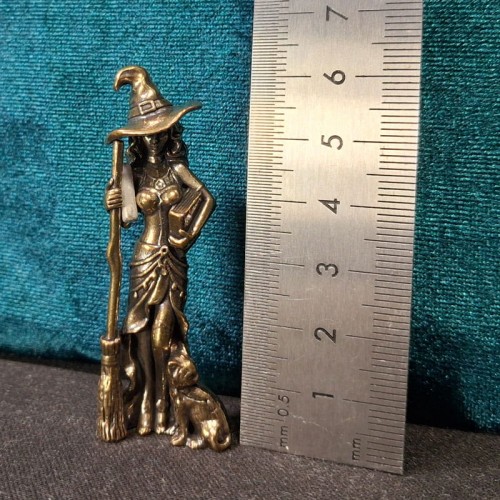 Фигурка отлита из прочного металлического сплава (латунь или цинк с покрытием). Она тяжёлая, устойчивая – не опрокинется от случайного дуновения. Детали проработаны: складки плаща, мордочка кота, переплёт книги и даже прутья метлы.