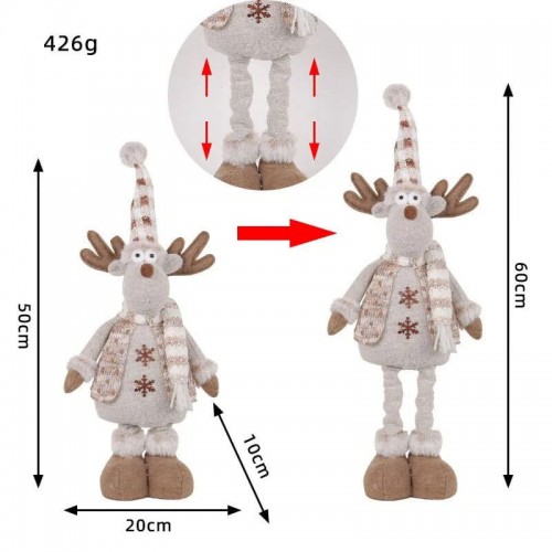 Новогодний олень, выполненный в виде мягкой игрушки. Он одет в вязаный свитер с узором в виде снежинок и шарф, что придает ему праздничный вид. Олень стоит на двух ногах, что делает его похожим на человека. На голове у него шапка с помпоном, а на носу - красный нос, что добавляет ему очарования. Игрушка выглядит очень мило и уютно, идеально подходя для украшения дома в новогодние праздники.